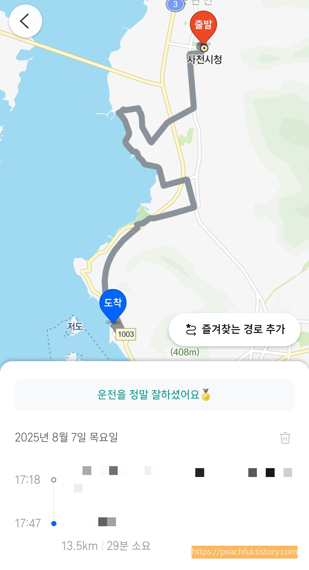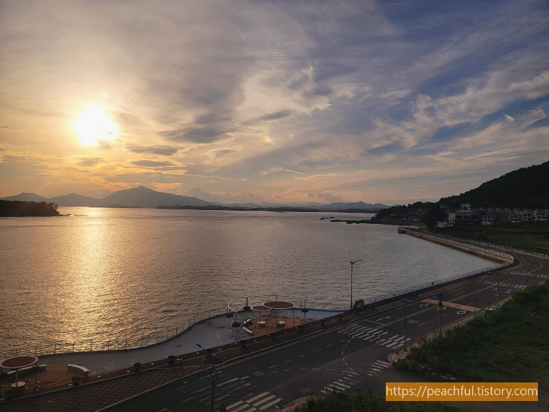숙소로 가는 길도 사천시에 도착했을 때처럼 자동차 전용도로를 이용하면 편했지만 바닷가를 끼고 드라이브 한 번 해보고 싶어서 꼬불꼬불 마을길을 따라 이동한 덕분에 숙소까지 가는 시간이 2배로 늘어났다 ㅎㅎㅎ